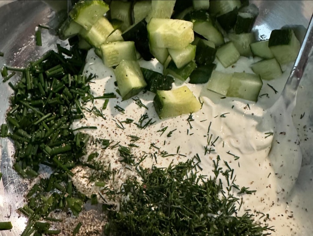Then toss them in sour cream, a little mayo, lots of fresh dill, diced cucumbers, chopped chives, a little cajun seasoning and cracked pepper. I didn’t measure anything, but it’s so easy to throw together. We LOVED it. This is gonna be a new summer fave for grilling!!!
