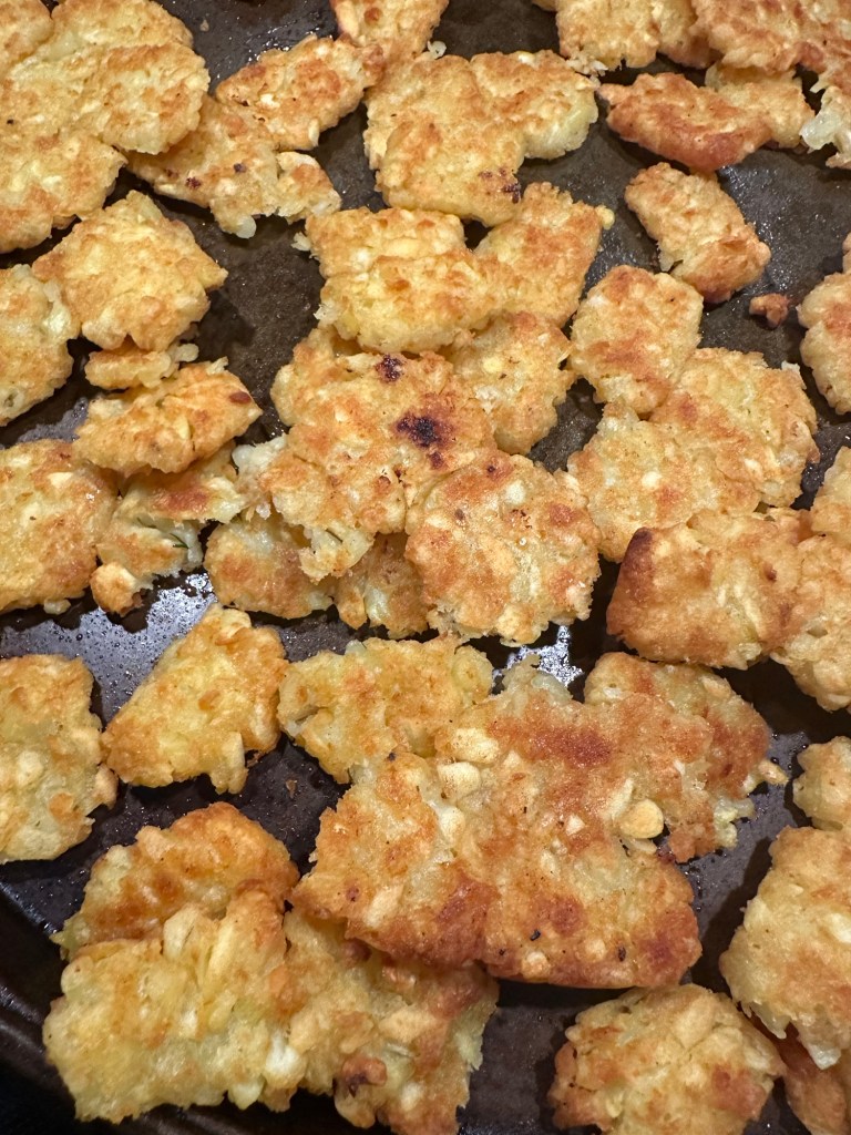 Toss tater tots on a pan in the oven at 500 degrees, remove after 5 minutes and smash them flat.