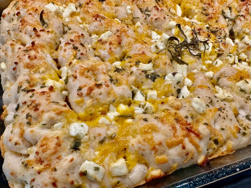 Place toppings. Continue dimpling with your fingertips until the dough feels soft and bubbly. Bake at 375 for 18-22 minutes. I like mine to reach 208F internally.