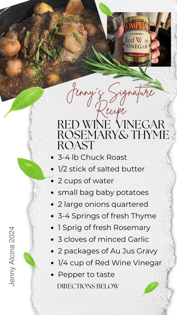 Flip Roast, drop to LOW and add all ingredients- Red Wine Vinegar, Onions, garlic, potatoes, gravy mix and water and herbs. Cook a remaining 6 hrs or until roast is tender and falling apart.