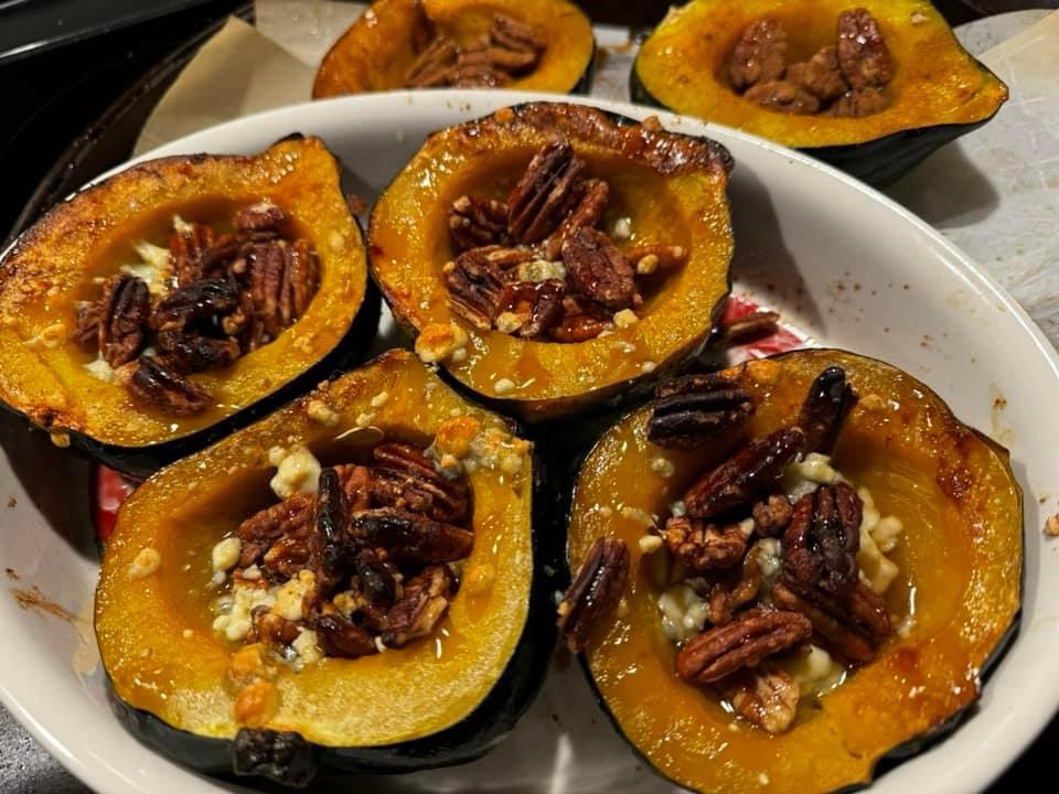 Flip squash and fill with bacon crumbles, blue cheese, and pecans. Drizzle with honey or maple syrup and return to oven for 10 minutes.