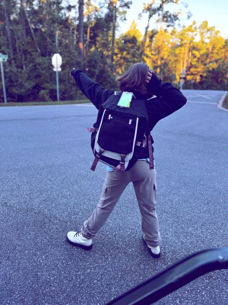 The bus comes to our door this year for Gage, but I still have to drive Harper to our neighborhood entrance to catch her bus, and the bus app hasn’t been working since Tuesday. So we just go early and wait and wait some more.