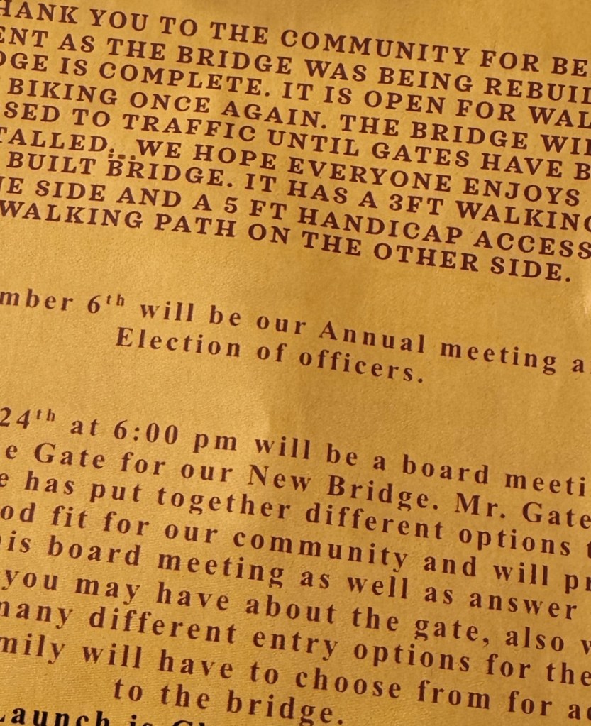 Our HOA meeting was at the first of the month and the bridge in our neighborhood and the kayak launch is re-opening November 1st, so we’ll actually be a gated community again, which means her bus route will be subject to change AGAIN– but it should pull up at our driveway like his does..