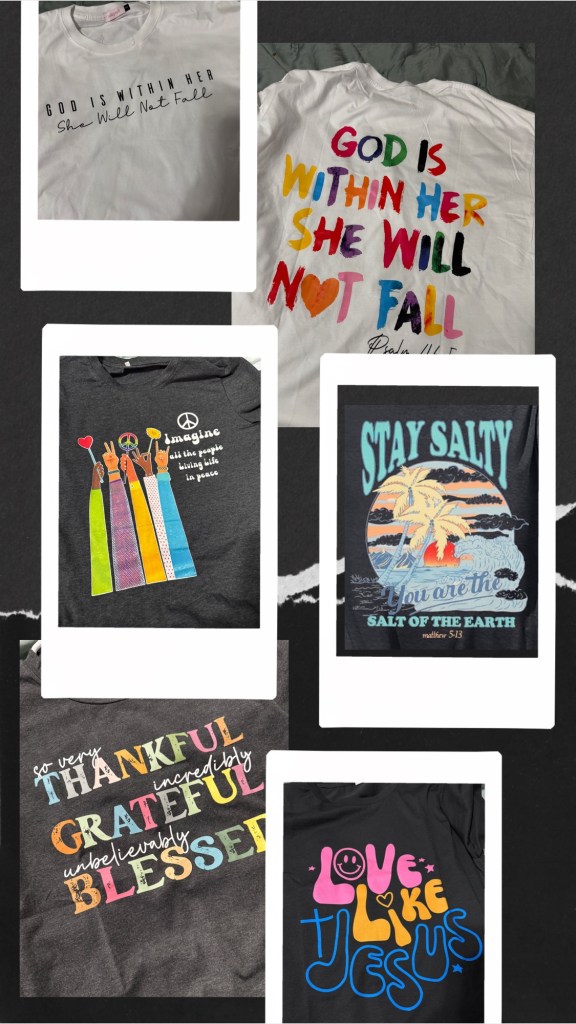 I found all of these on Amazon deals. They were all 10$, expect The Psalms one . It was 15$ My daughter is 10, but she likes to wear women’s T-shirts in XS because they’re oversized and a few inches longer than a girls XL. They’re all so cute. 🤍