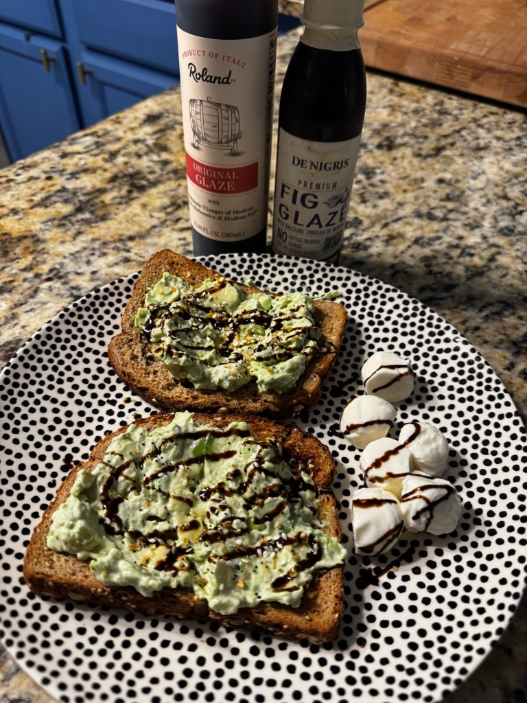 I mashed one whole avocado with a drizzle of olive oil, a shake of lemon pepper, toasted sesame seeds (black and white) and a drizzle of balsamic.