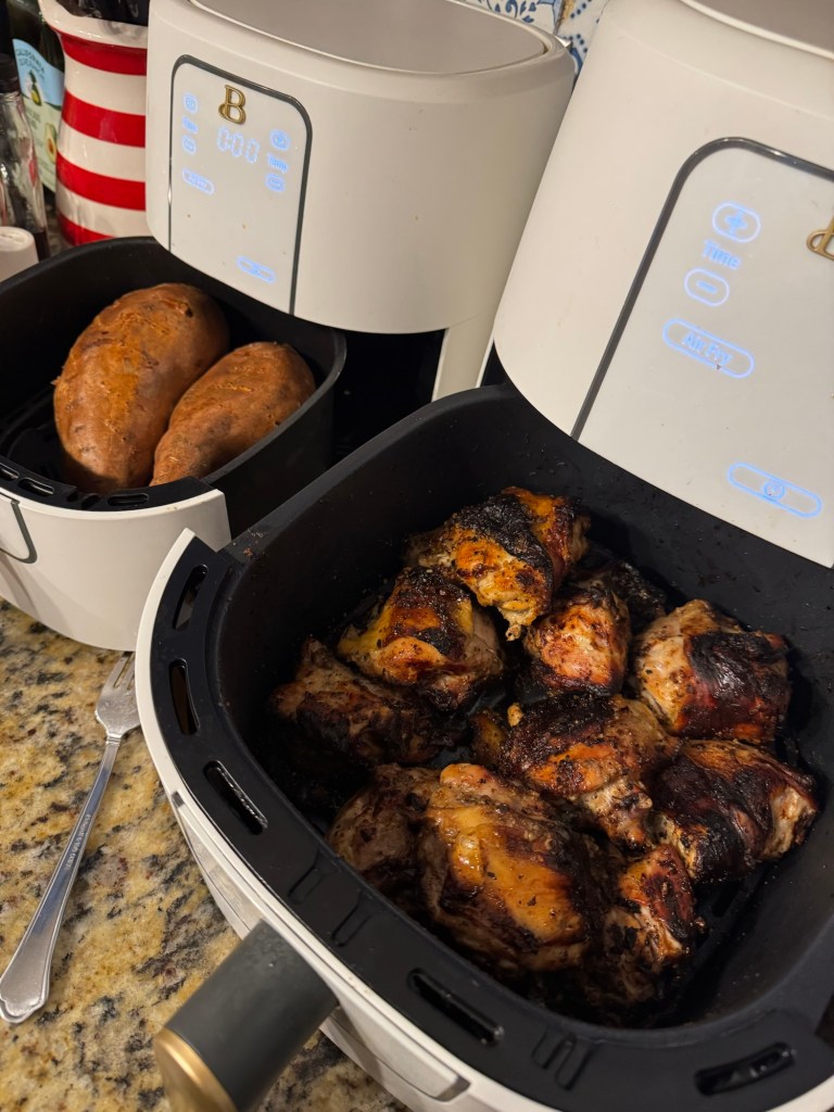 Dinner Tonight: Chicken thighs with Paleo seasoning and sweet potatoes with maple syrup and cinnamon.