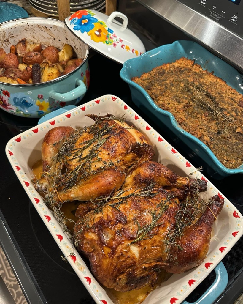 Oh yeah! Gary usually does his amazing Rib-eyes on Christmas and this year he made a Turkey for Thanksgiving. He also makes the best spiraled stuffed potatoes! He’s become a really good cook through the years. Gary’s Mom always does her bacon smothered cabbage and it’s fantastic!