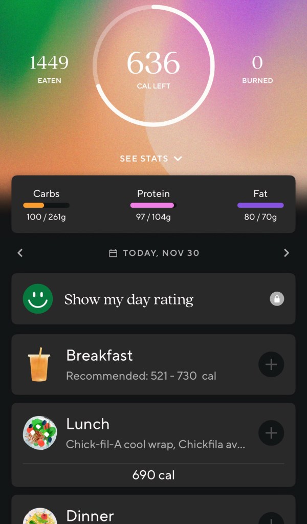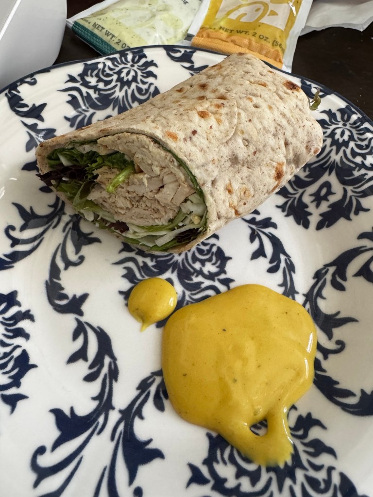 Today around 12, we picked up Chick-fil-A on our way home. I got a wrap AND 12 nuggets. No fries or drink. (I skipped breakfast). I used one Polynesian sauce, one honey roasted bbq sauce and their fat-free honey mustard dressing for the wrap. I usually use the avocado lime but it’s 310 calories. Not that I’d ever use a whole pack (not even half) but that’s still a lot higher.