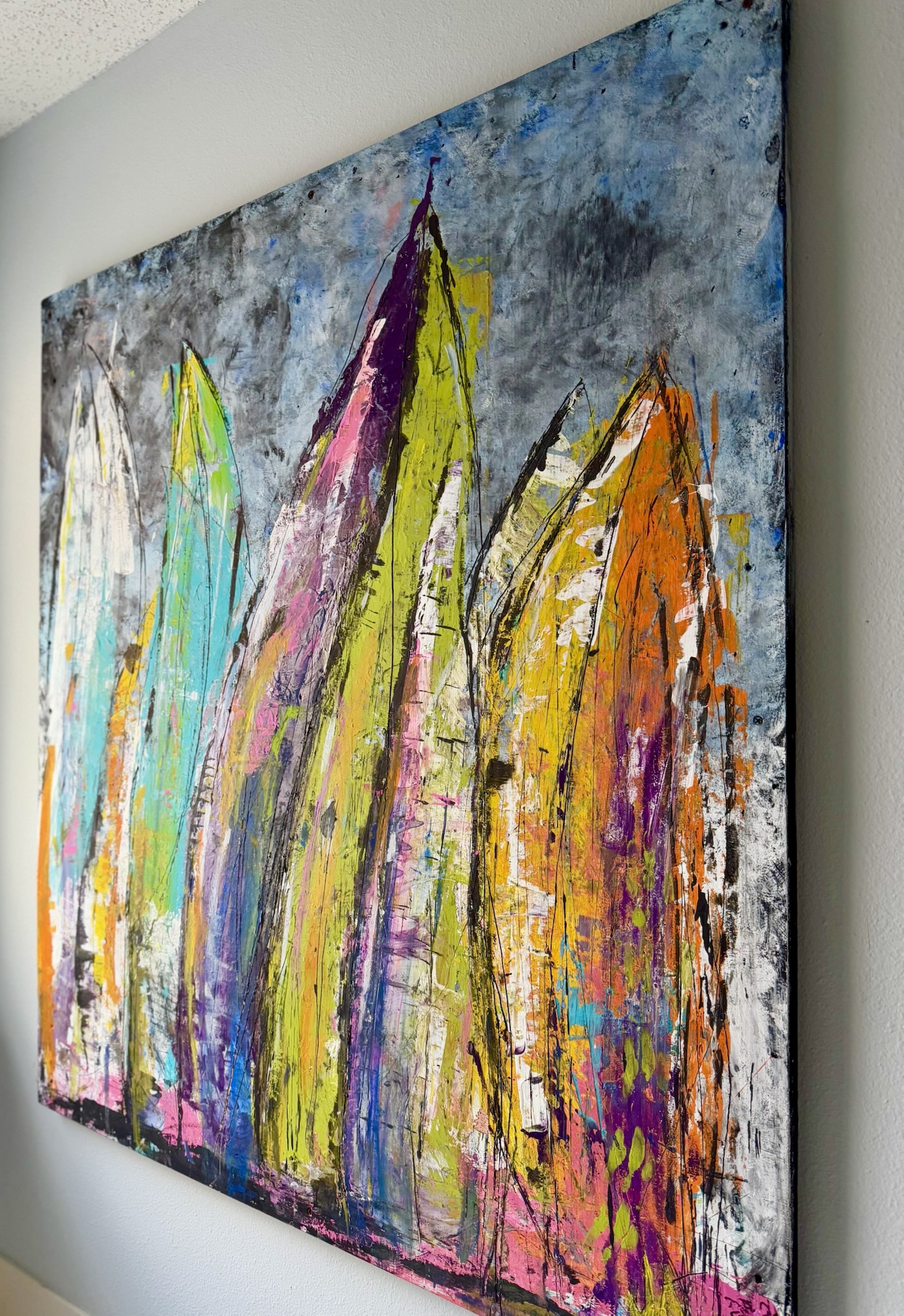 We hung my sailboats. 🤍 I like it so much better than the mirror. I painted those 2 years ago and Gary just loves them. I carved around the board and details so there’s a lot of texture. It brought in some needed color!