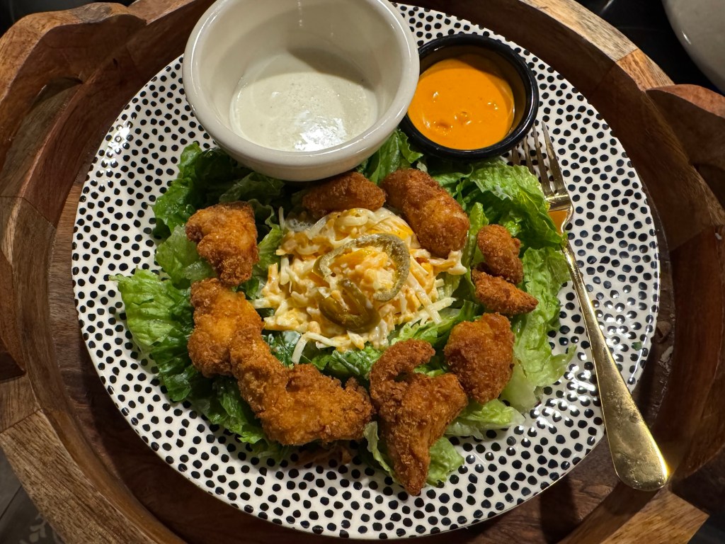 This was lunch today, Romaine lettuce. Homemade Pimento Cheese (made with Swiss, Cabot Lite 50 Sharp Cheddar Cheese, Dukes Mayo and Candied Jalapeños), Real Good High Protein Chicken Nuggets with Chicken Dippin’ Sauce and Lite Ranch