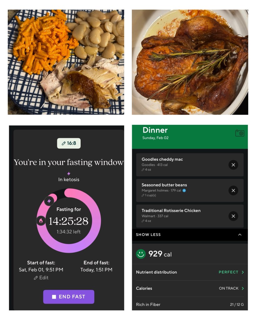 I had enough rotisserie chicken, beans and Goodles to make exactly 3 meals (one for each day). šŸ™ŒšŸ¼ It had 70 grams of protein so all I had to do is have a protein drink and a kind bar a few hours after my meal. It held me over and I got my 100g of protein!