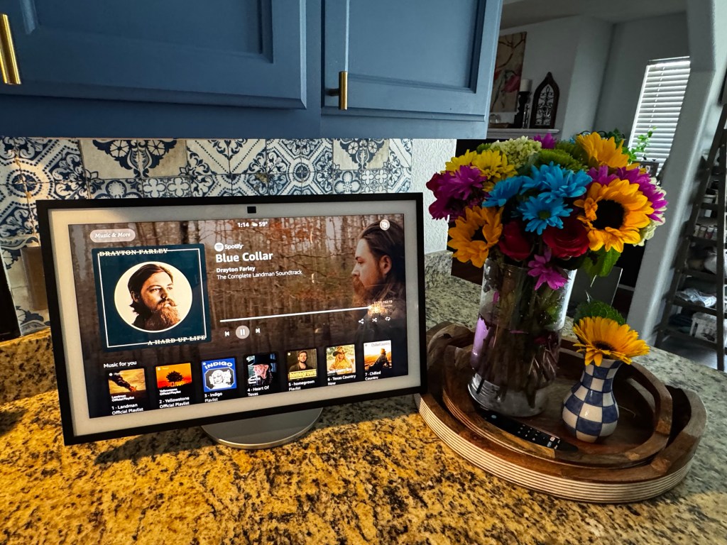Gary surprised me with the Echo Show 21 and I absolutely love it. It has all of our Ring cams, outdoor lights and thermostat on it and all of our calendars, to do lists and shopping lists etc. I am loving watching recipe videos and vlogs online for cooking and the kids can watch tv or Netflix while they eat at the bar.
