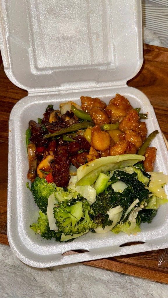 Super Greens (kale, brocolli and cabbage in garlic sauce) with Pepper Sirloin and Sesame Chicken.