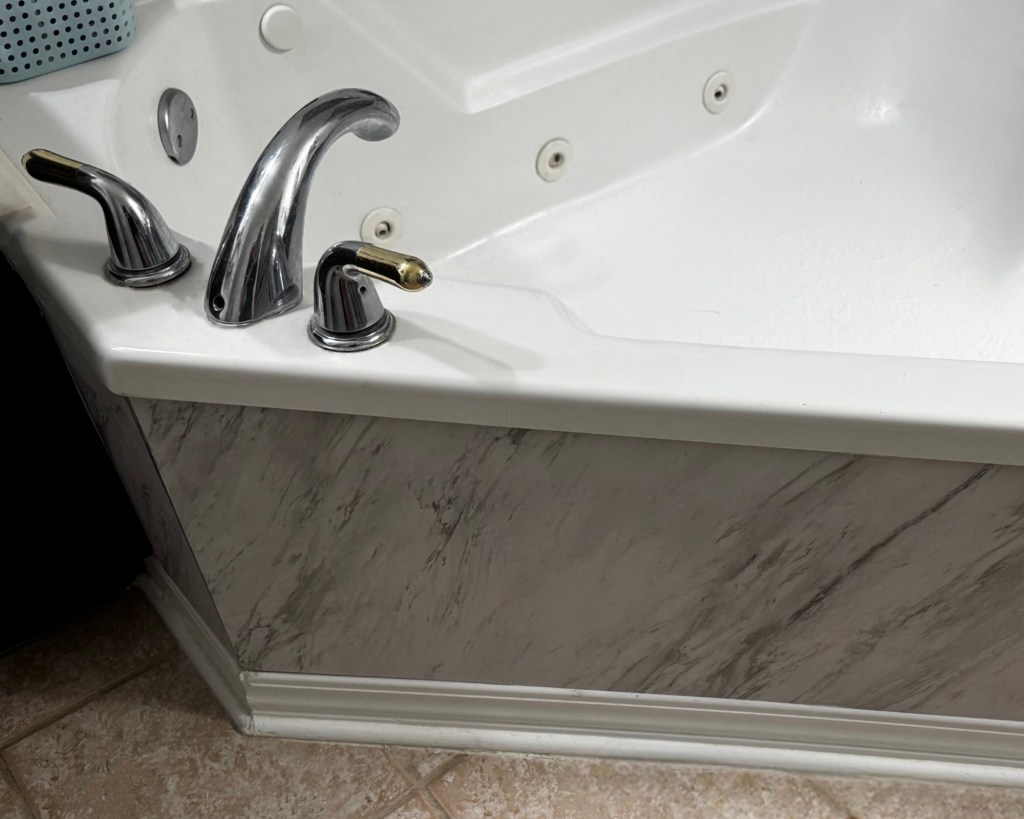 We’re hoping to have a wall to wall shower eventually and gut this tub, but this was a good cosmetic upgrade. Now I need to change out the fixtures. I want something brassy or antique gold. I find jet tubs and jacuzzis to be really nasty. 🤮 The funk that collects in there is so gross’s. I use a cleaner once a month and take all the heads off bc it freaks me out. 😂😂😂 That’s probably weird but whatever.