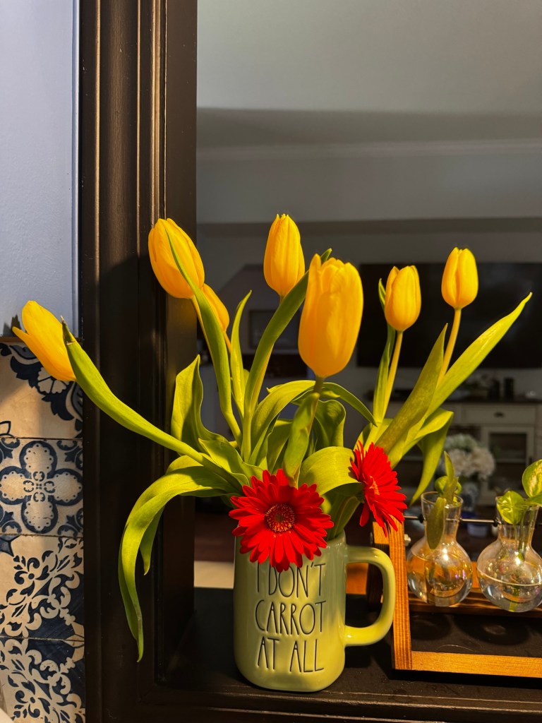 Gary brought me these tulips Sunday, and they are just opening up today. 🤍🤍🤍 He always brings me flowers when I’m sick, and I’ve been sick for a week so I’ve ended up with them twice. Hah! I really think I had the flu. I seem to be at the end of whatever it was, but this was no regular cold. The body aches and headaches have been pretty awful but somehow I’ve managed to be fairly productive in the daytime. Unfortunately Gary now has it, and I pray he doesn’t have the headaches I’ve had. He’s been the sweetest nurse and now I get to be his. 🤍