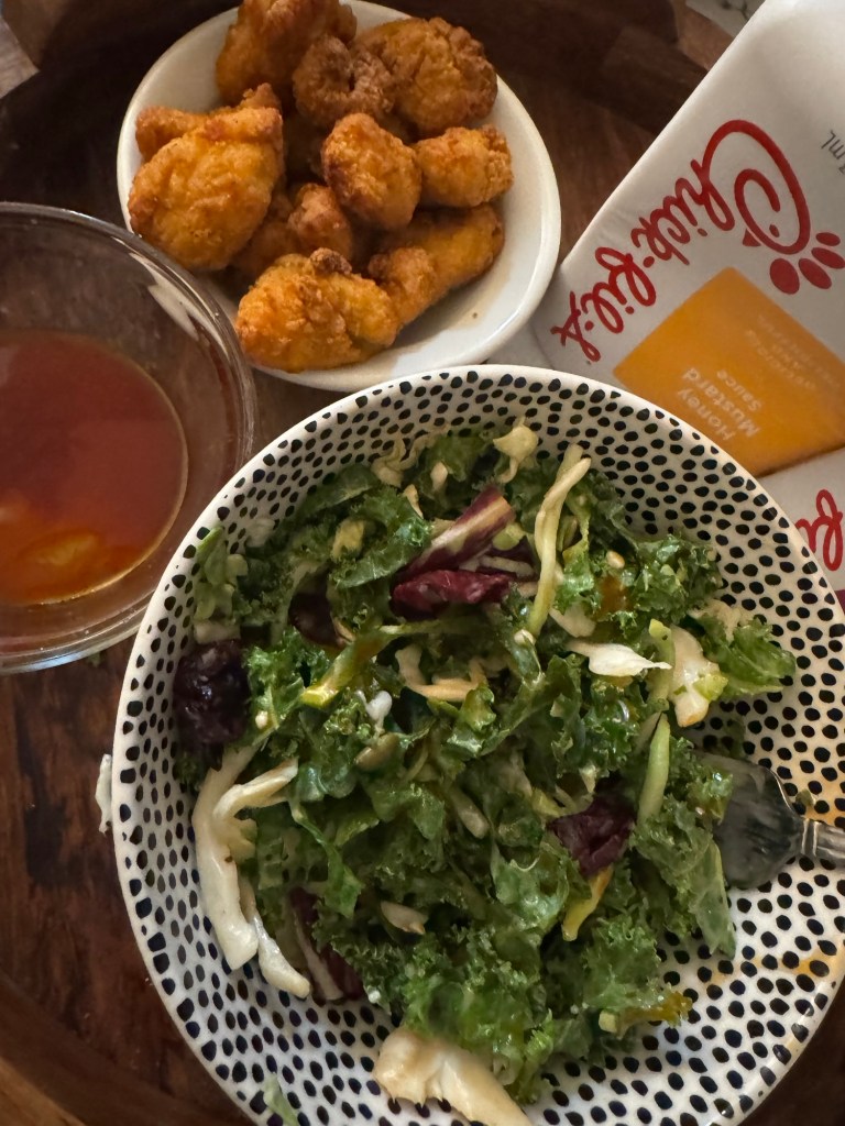 Just Bare nuggets and the perfect Kake salad with kale, broccoli, Brussels sprouts, green cabbage, and radicchii, dried cranberries, pumpkin seeds, and a creamy poppyseed dressing!