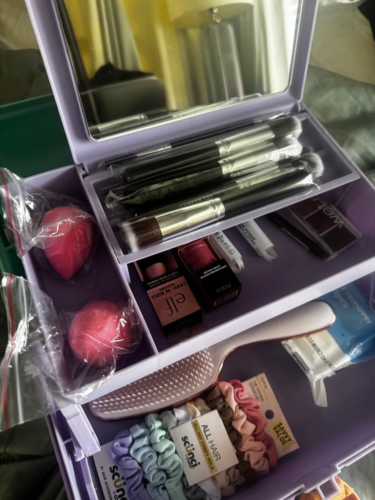 I also found her a cute original caboodle, and filled it with lots of her favorite things. Hair scrunchies, barrettes, lipglosses, mascara, a new hairbrush, blush, makeup wipes, a new set of cosmetic brushes, etc., etc.