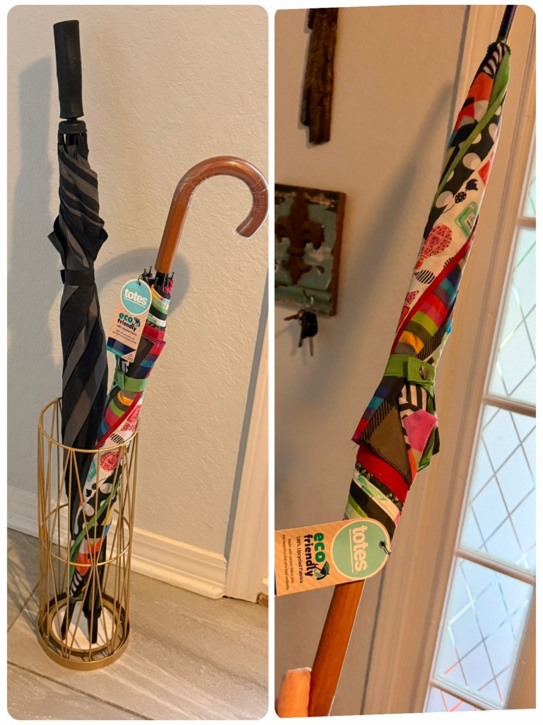I picked up a cute umbrella stand and a new Totes umbrella at Home Goods. 🤍 The kids always throw their umbrellas on the floor so now they’ll have a place to put them. I wasn’t sure it would be heavy enough and where the water would go but it has a Soakstone at the bottom (the white insert) that soaks the water up.