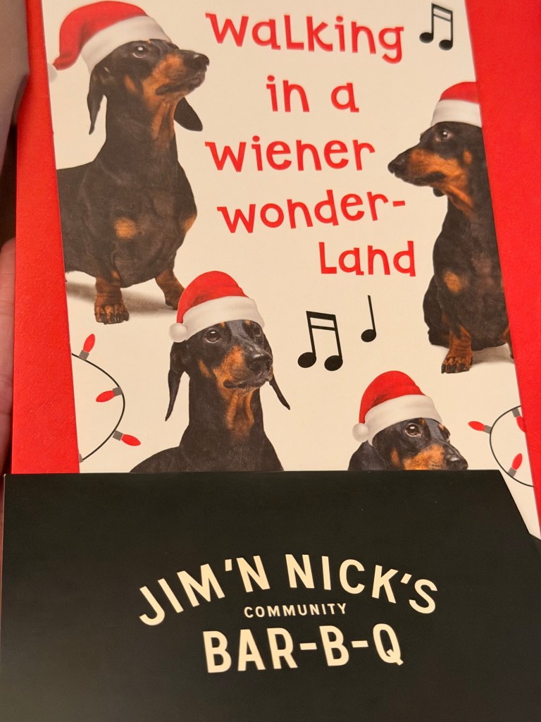 I had to share.. our neighbor gave us this Christmas card with a BBQ gift card, and it completely made my day. We love our little Rusty. We love a Weiner Wonderland. 😂
