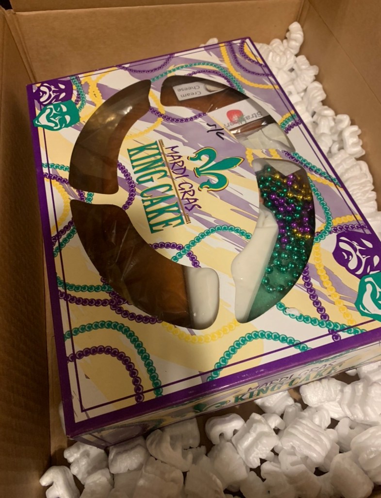 Our favorite King Cake from Maurice Pastry in Metairie La. 💛💜💚 We order every year! Much better than Gambinos. I sent one to my sweet friend who is struggling right now too 🙂 I got her the strawberry. We love the cream cheese.. You can still order on the Gold Belly App. 🖤