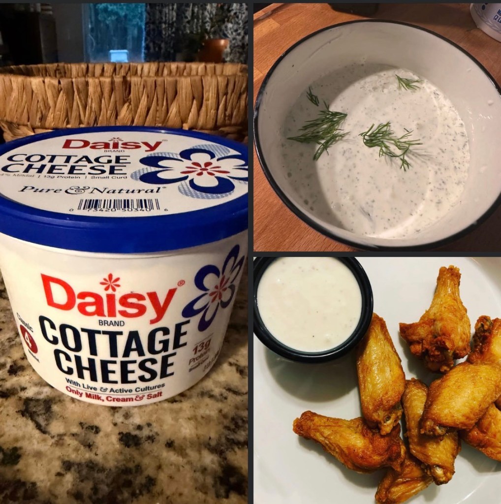 If you want a good high protein snack, blend 1 cup of Cottage cheese with a little hidden valley ranch seasoning, a squeeze of lemon, ( I added fresh dill just bc I had some) and a tbsp of milk and it makes the best dip. We eat it with pop corners or quest chips. I ate a half cup and a bag of quest chips and got 41g of protein with 282 calories. I use it for chicken wings too!!
