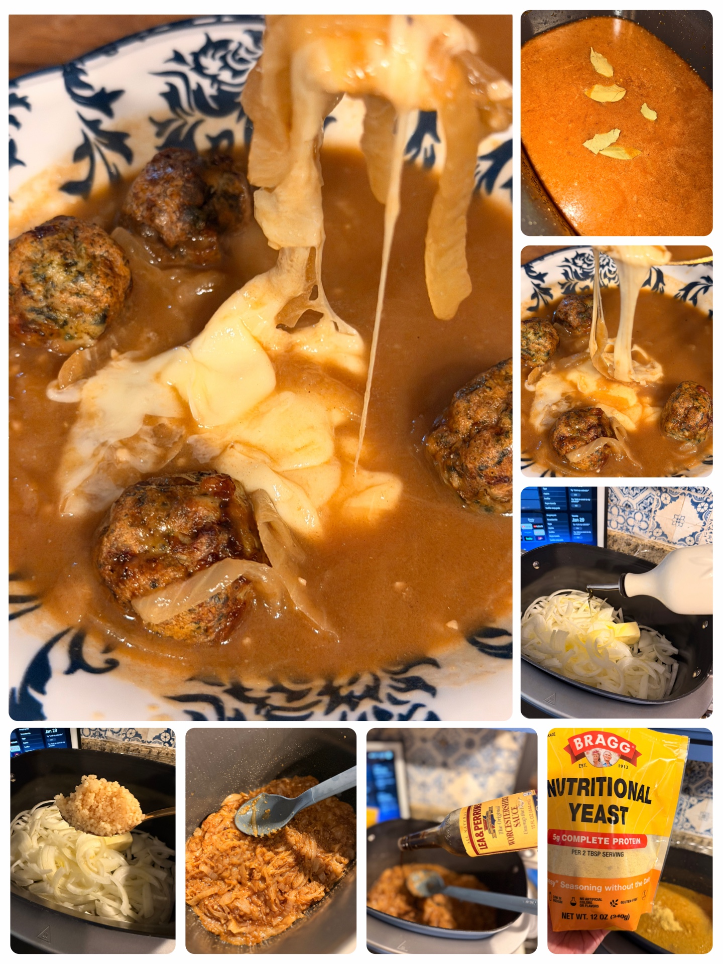 I made the best French Onion soup with beef bone broth, topped with reduced fat Swiss cheese. I added Nooch (nutritional yeast) to add more protein,and it acted like a thickener so that was win, and I tossed in some chicken meatballs with feta cheese and spinach in them. Ohhhh my goodness. I made it in my Ninja foodie in under an hour. The sauté option is AMAZING. This is a new rotation in the Alcina house!