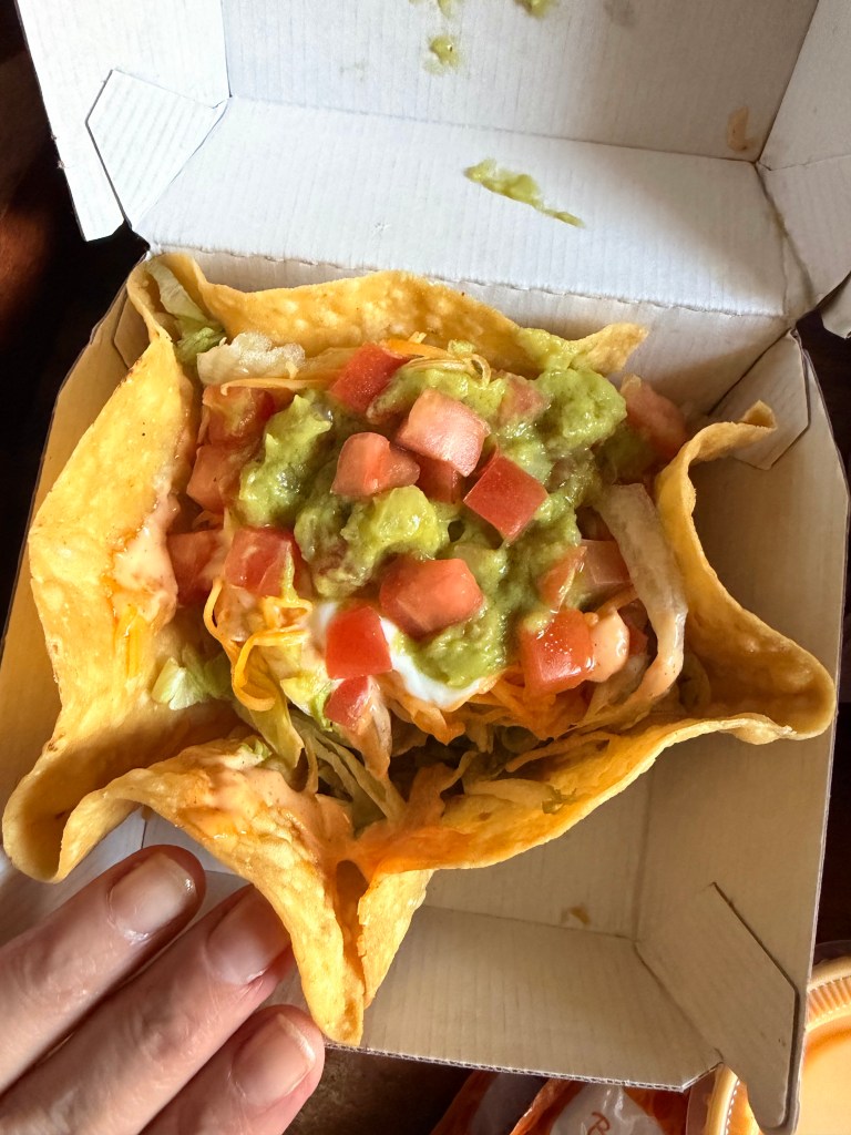 I wasn’t sure what was on it so I got a side of cheese sauce, but it didn’t need it at all. Really yummy! A lot more filling than it looks. It’s very small but it’s heavy. Lots of beans, meat and lettuce.