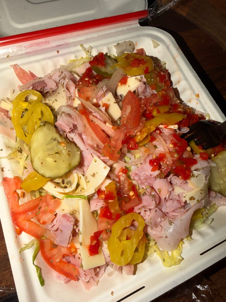 I got the #11 Stickball Bowl at Jersey Mike’s with extra meat and cheese with lettuce, onions, tomatoes, pickles, banana peppers, pepper relish and red wine. NO OIL. (The oil is 270 calories!!!) It’s 540 calories and 50g of protein!! 🤯 It’s so good.