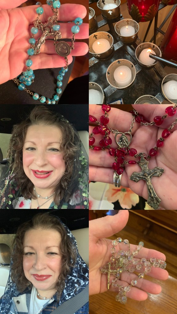 My friend Shookie sends me a picture every week of her wearing her veil and a photo of her rosary. She also sends me a picture of the candle she lit as she prayed for me at church.