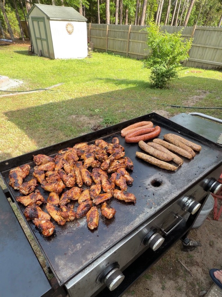 We had such a fun weekend. we had some Boudin & a few different sausages that Gary’s Aunt brought us from NuNu’s in New Orleans, and the kids have been wanting barbecue chicken wings, so we decided to just make a big ole feast out of it. One of the sausages was with pineapple and it was so delicious!! The wings were fantastic too. I made deviled potato salad, corn on the cob, low-sugar banana pudding and we had the best watermelon! It’s a little early in the season for watermelon, but these were good! We grabbed two little ones from Publix yesterday. 🍉